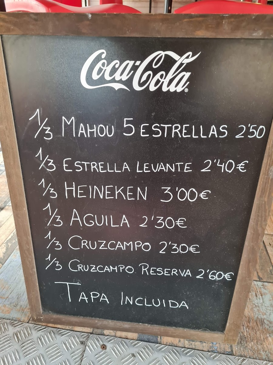 Guests can also find traditional tapas including patatas bravas, ensaladilla, and combinations featuring ham and cheese. Meat options are represented by items like lamb chops and beef entrecôte, providing choices beyond seafood. The beverage selection includes coffee drinks and beer, suitable for light refreshments or casual dining experiences.