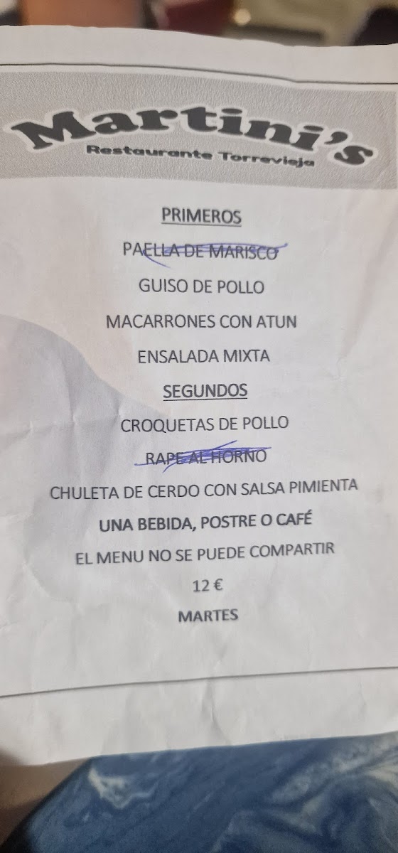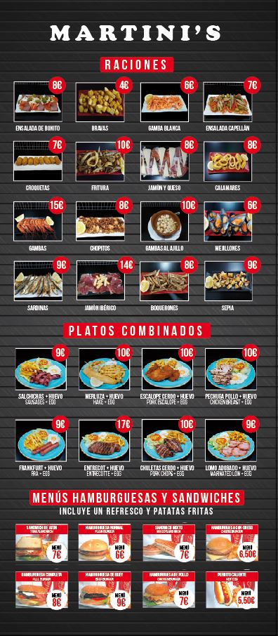 The menu at Restaurante Martini's offers a selection of Mediterranean and bar & grill dishes, reflecting the local culinary traditions of Torrevieja, Alicante. The menu includes a variety of seafood options such as grilled mussels, white shrimp, sardines, cuttlefish, and lobster rice dishes, demonstrating a focus on fresh and regional ingredients.